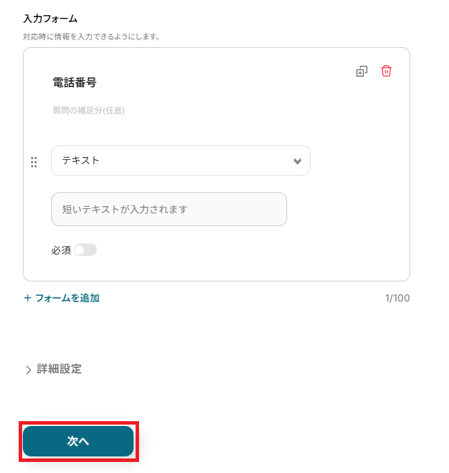 今回は電話番号を入力できるよう、以下のように設定しました。