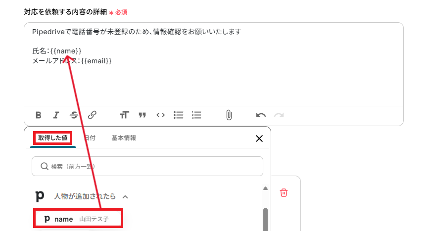 「対応を依頼する内容の詳細」は、取得した値を引用し入力できます。