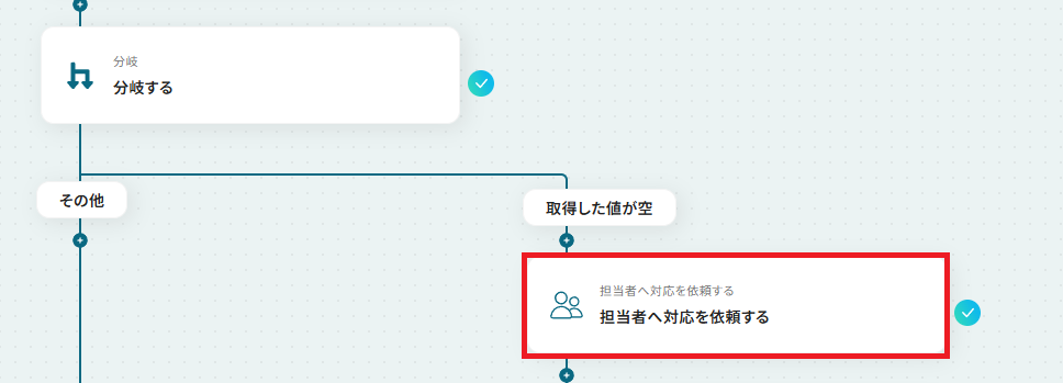 - 次に、オペレーションで「分岐機能」を設定し、特定の情報が不足している場合に後続のアクションが実行されるよう条件を設定します