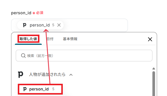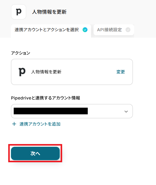 - 最後に、オペレーションでPipedriveの「人物情報を更新」を設定し、担当者から回答された情報でデータを更新します