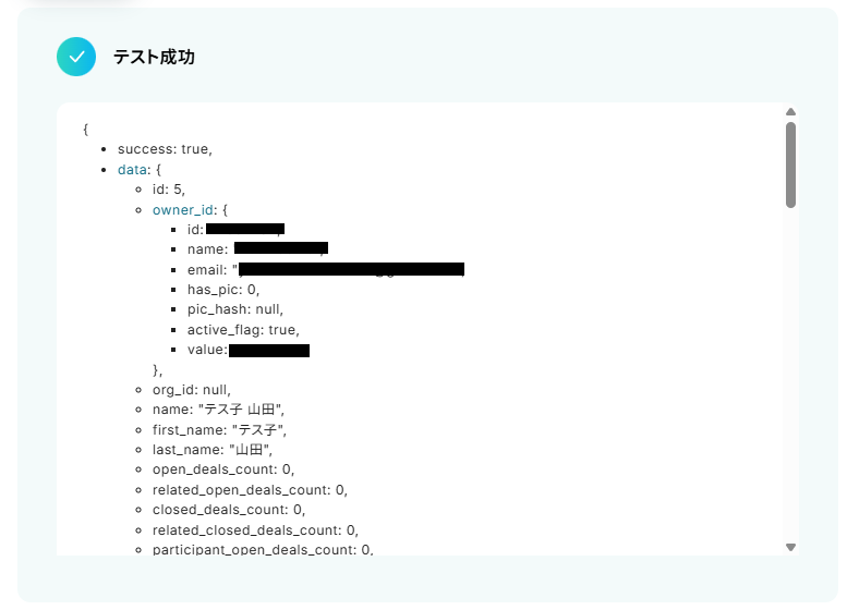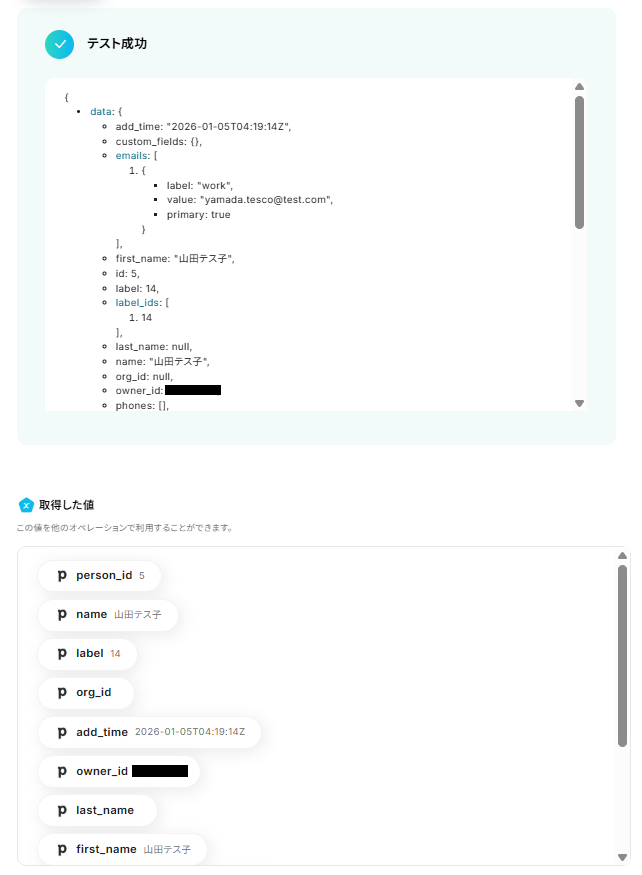 - Pipedriveの各登録アクションでは、固定値を入力するだけでなく、前段のTrelloやAIから取得した情報を変数として埋め込むことで、動的なデータ登録が可能です。