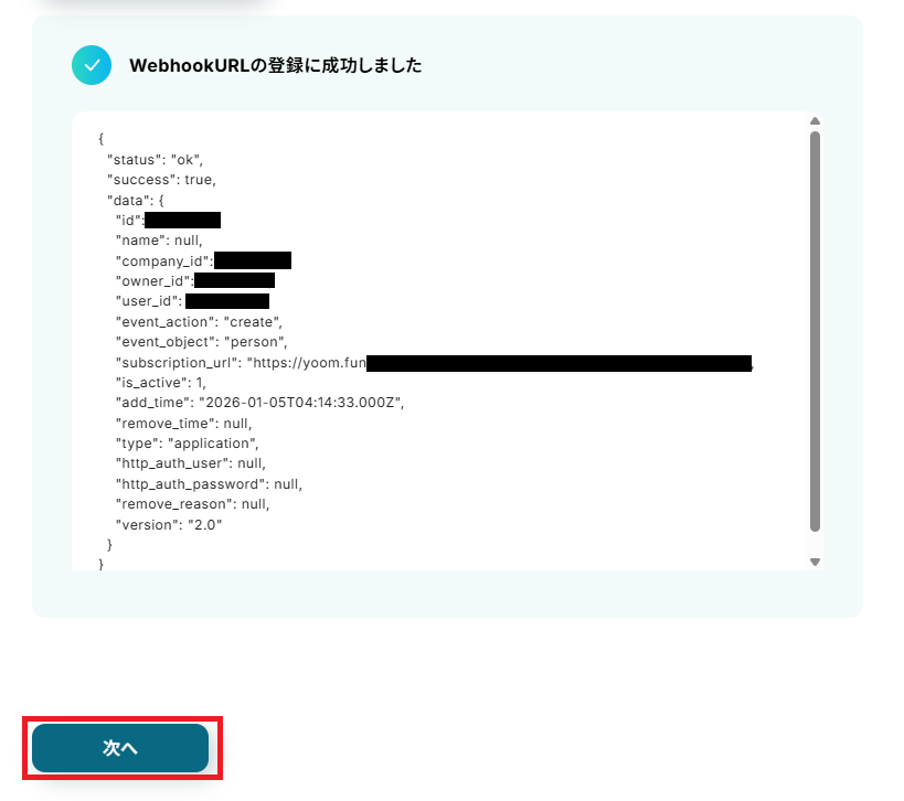 WebhookURLの登録に成功したら「次へ」をクリックしましょう。