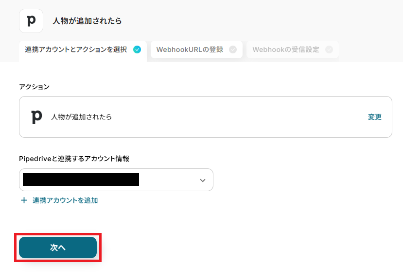 Yoomと連携するPipedriveのアカウントに間違いがないかを確認し、「次へ」をクリックしましょう。