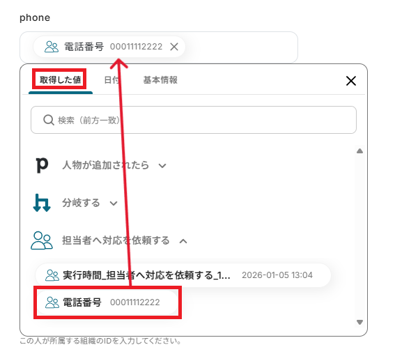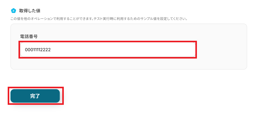 取得した値に、テストで使用する電話番号を入力してみましょう。