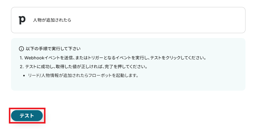 作成が完了したらYoomに戻り「テスト」を押して下さい。
