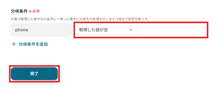 今回は電話番号が空の場合にのみ処理を分岐させるため、下記画像のように設定しました。