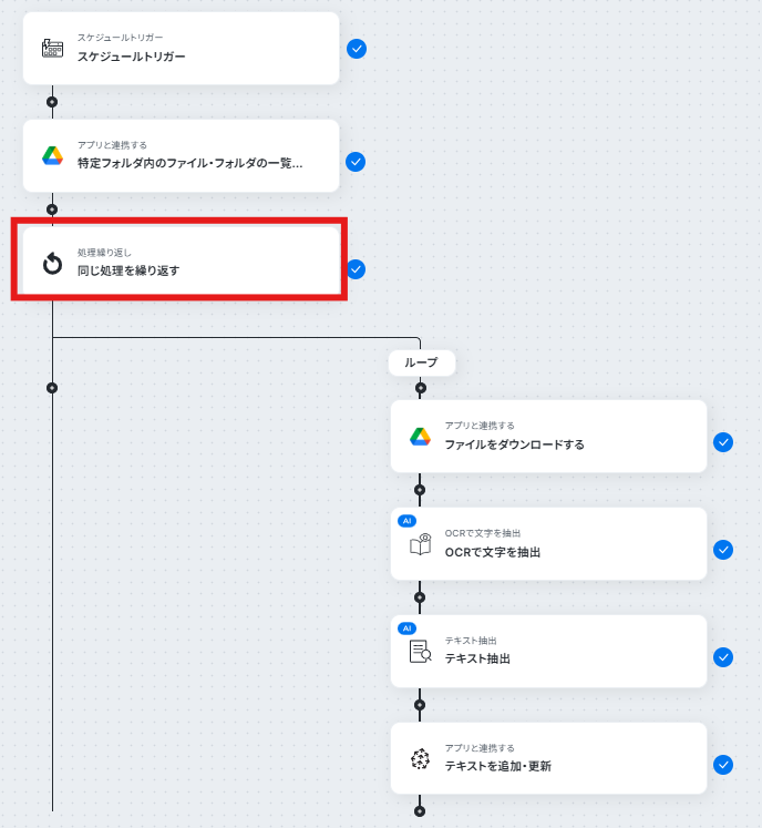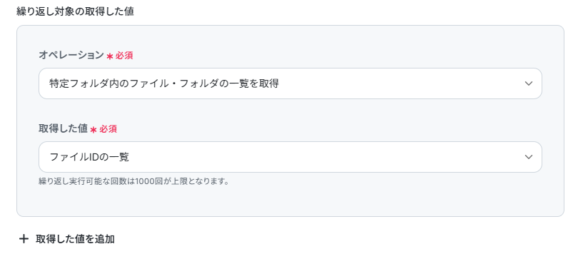 フォルダに複数のファイルがある場合、リスト形式でファイルの情報が取得されます。 この情報を、ファイルごとに個別に切り分け順番に処理するために、繰り返し設定を行います。