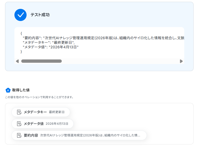 ここまで終わったらテストボタンをクリックしましょう。テストが成功し、各項目の要約や抽出が行われればOKです。