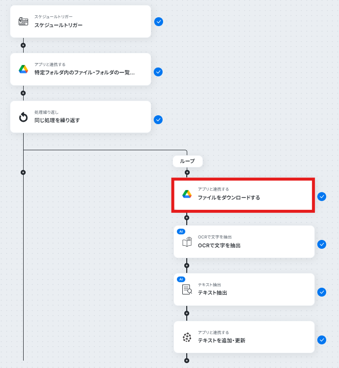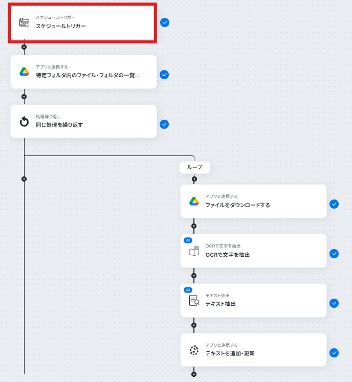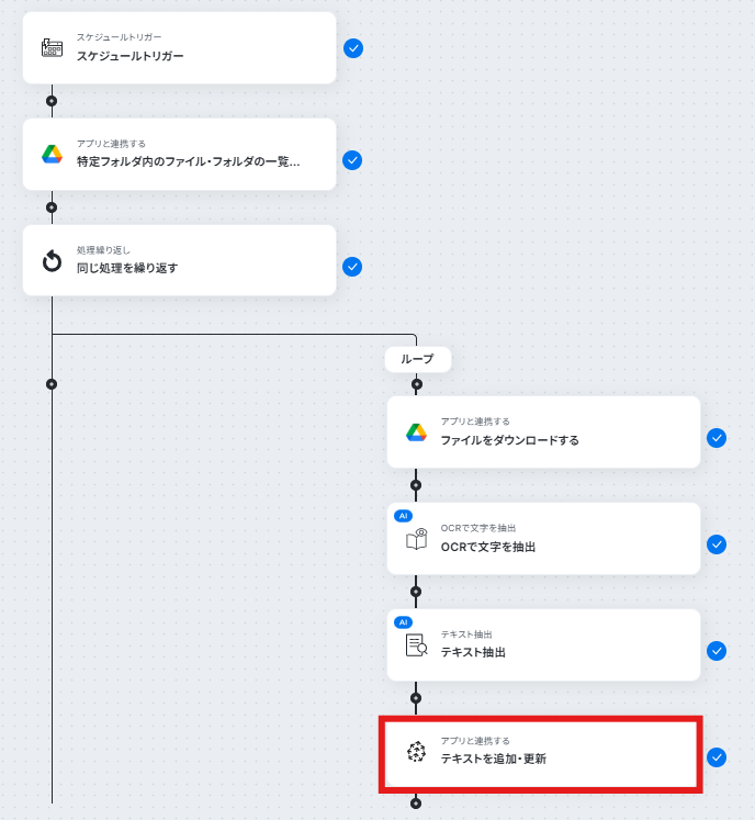 はじめに、Google DriveとPineconeをYoomと連携します。 次に、トリガーでスケジュールトリガーを選択し、定期的にフローを起動させる日時を設定します。 オペレーションで、Google Driveの「特定フォルダ内のファイル・フォルダの一覧を取得」アクションを設定します。 取得したファイルそれぞれに対して処理を行うため、繰り返し機能を追加します。 繰り返し処理の中で、Google Driveの「ファイルをダウンロードする」アクションを設定し、続いてOCR機能で「OCRで文字を抽出」アクションを設定します。 AI機能の「テキスト抽出」アクションで、抽出したテキストを要約します。 最後に、Pineconeの「テキストを追加・更新」アクションを設定し、AIが要約したテキストを任意のレコードに連携します。 ※「トリガー」:フロー起動のきっかけとなるアクション、「オペレーション」:トリガー起動後、フロー内で処理を行うアクション ■このワークフローのカスタムポイント