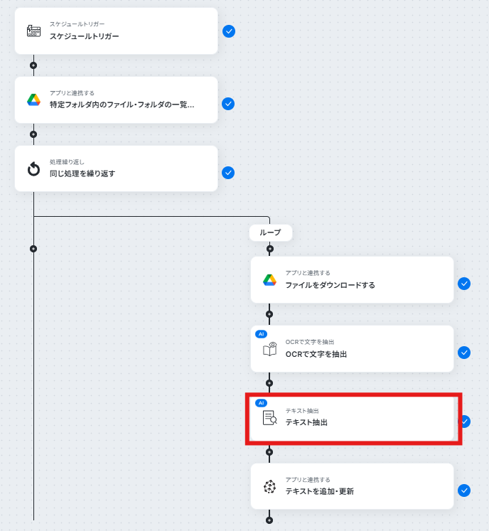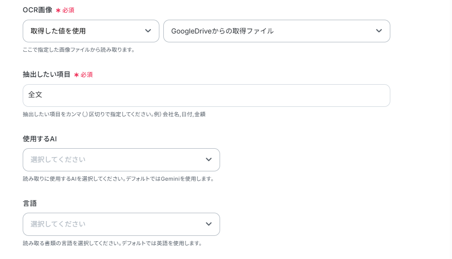 Google DriveでPDFを格納しているフォルダは、任意のフォルダIDに設定できます。 OCR機能の設定では、PDFファイルからテキストを抽出したい範囲などを任意で指定できます。 AI機能では、要約の指示内容(プロンプト)や抽出したい項目などを、目的に合わせて自由に設定できます。 Pineconeでテキストを追加・更新する際には、対象となるレコードIDなどを任意の値で設定できます。 ■注意事項