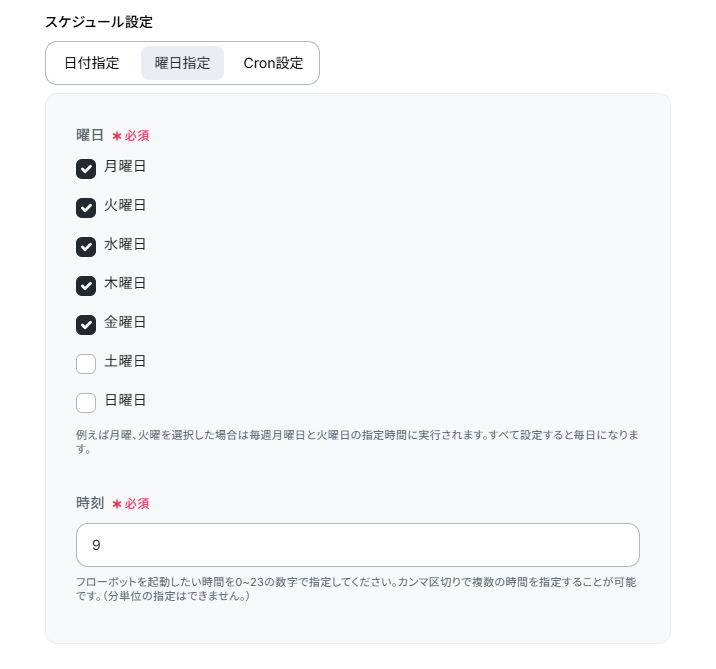 このフローは以下のように平日の朝9時に起動する設定にしています。 任意でスケジュールを設定しましょう。