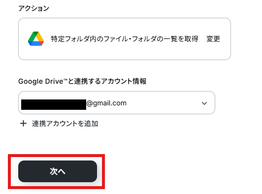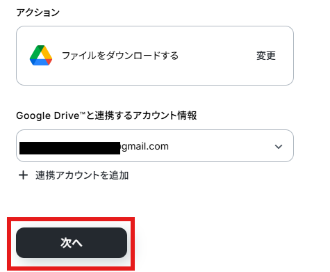 アクションはデフォルト設定のまま、アカウント情報は、連携したいアカウントが選択されているか確認してください。 確認出来たら「次へ」をクリックしましょう。