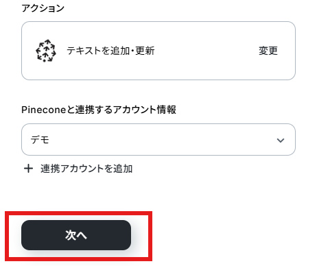 アクションはデフォルト設定のまま、アカウント情報は、連携したいアカウントが選択されているか確認してください。確認出来たら「次へ」をクリックしましょう。