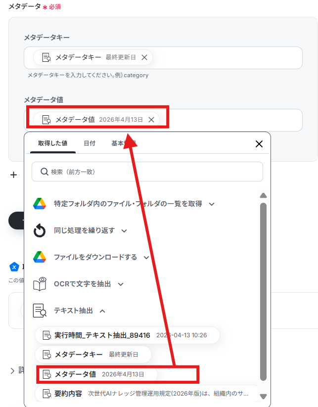 「メタデータキー」「メタデータ値」も下記のようにテキスト抽出の際の「要約内容」を選択します。