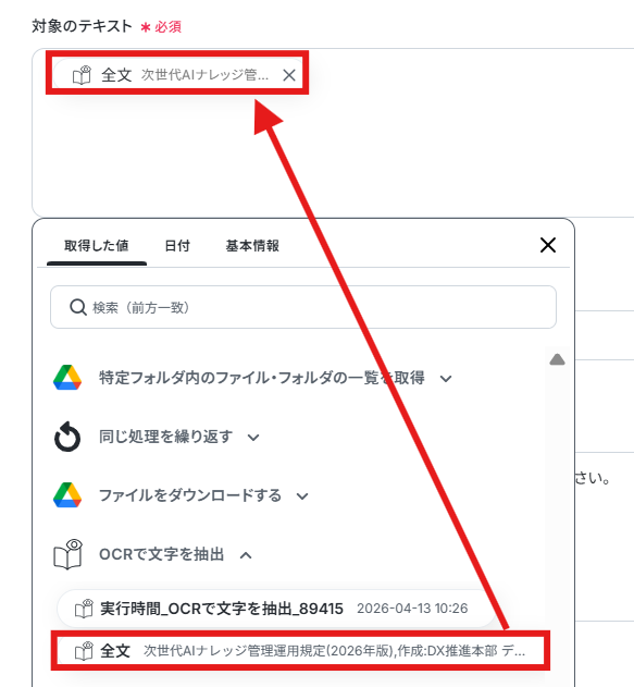 「対象のテキスト」に、前ステップで取得した値の「全文」を選択します。