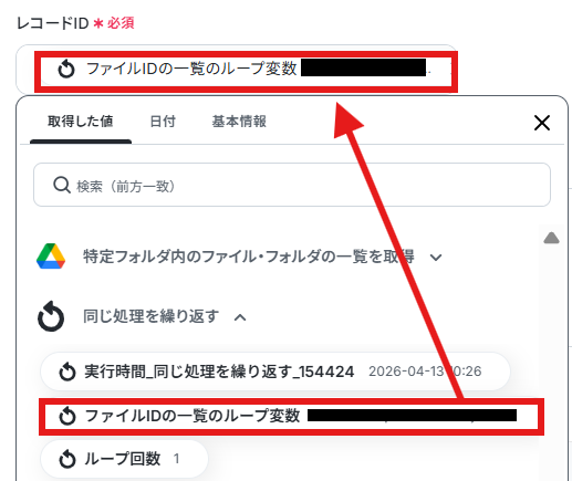 「レコードID」は以下のように「同じ処理を繰り返す」の取得した値から入力します。