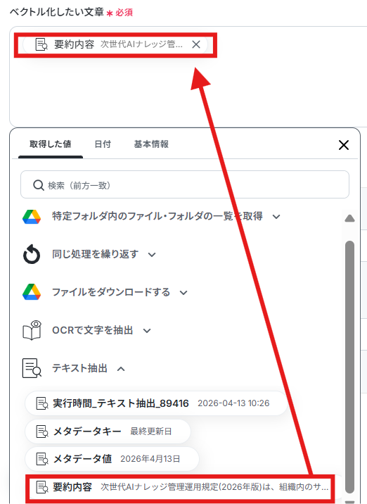 「ベクトル化したい文章」は下記のようにテキスト抽出の際の「要約内容」を選択します。