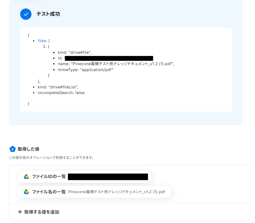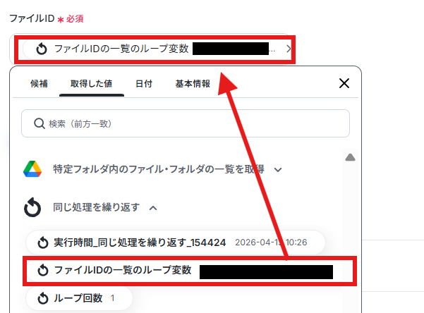 「ファイルID」は前ステップで取得した値から入力します。 取得した値を活用することで、固定値ではなく、トリガーが実行されるたびに最新の情報が反映できます。