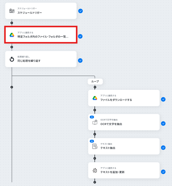 ステップ4:特定フォルダ内のファイル・フォルダの一覧を取得する 次にGoogleDriveの特定フォルダ内のファイル・フォルダの一覧を取得します。