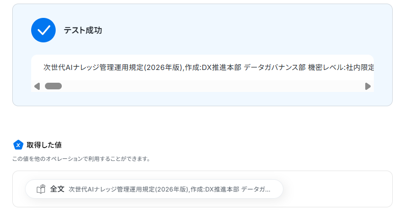 ※取得した値とは? 取得した値とは、トリガーやオペレーション設定時に、「テスト」を実行して取得した値のことを指します。 取得した値は、後続のオペレーション設定時の値として利用でき、フローボットを起動する度に、変動した値となります。詳しくは以下をご覧ください。