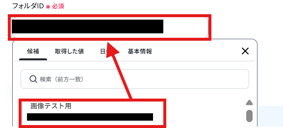 ファイルをアップロードしたフォルダを「フォルダID」を候補から選択してください。