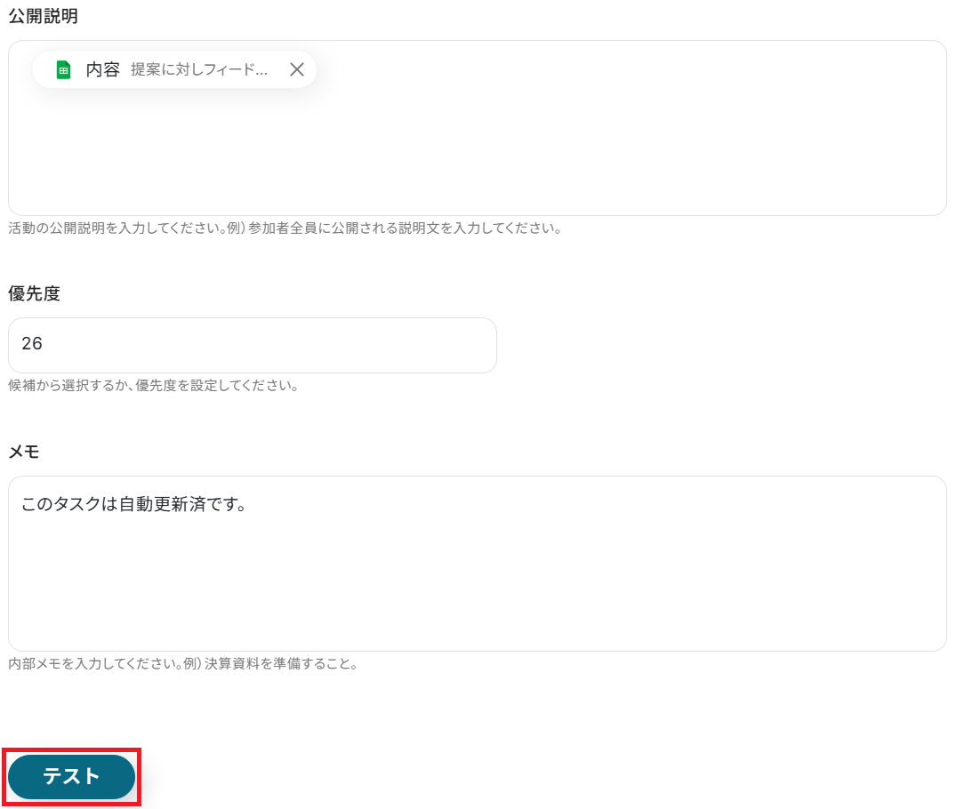 アクティビティIDの欄には、Google スプレッドシートから取得した「アクティビティID」の値が予め設定されているのでそのままで大丈夫です。