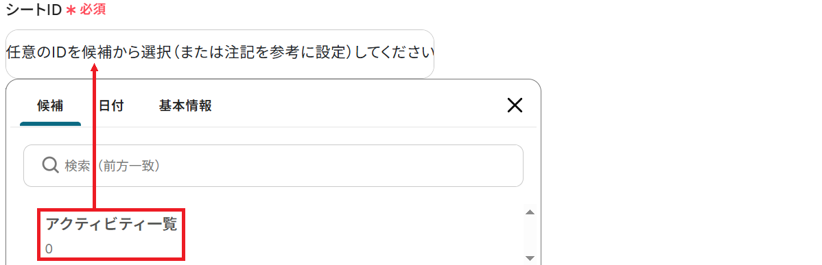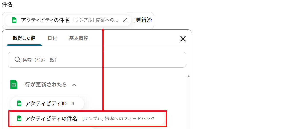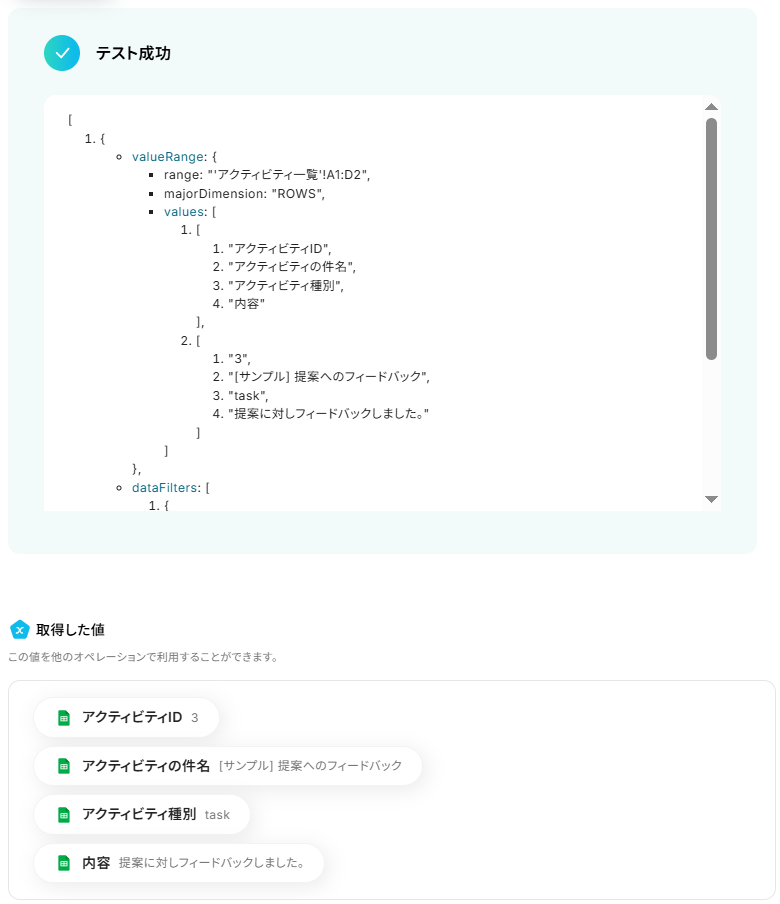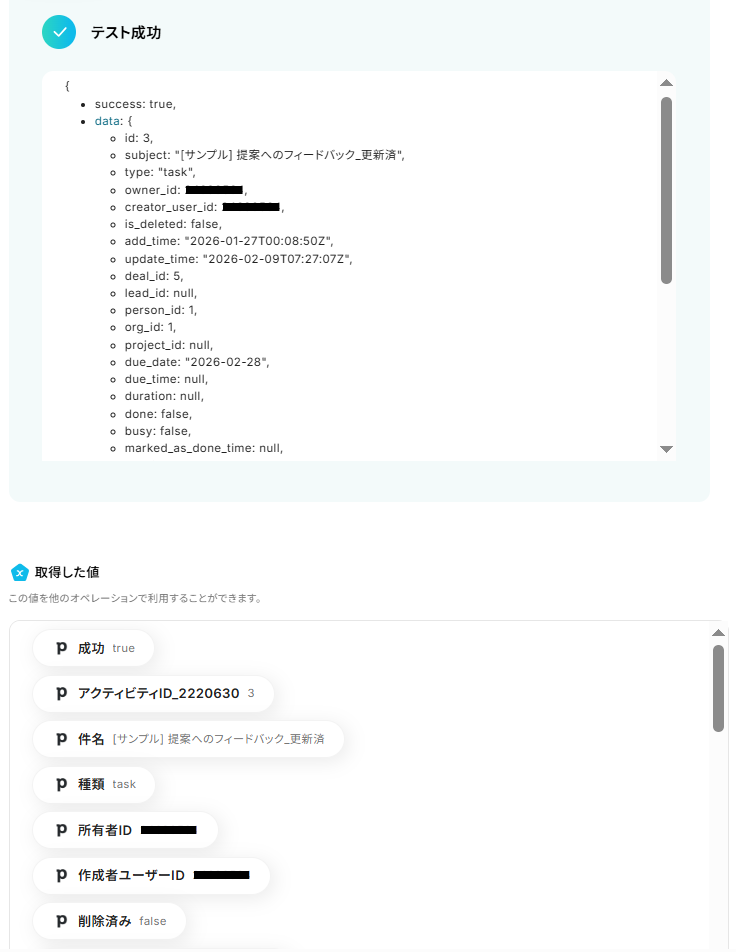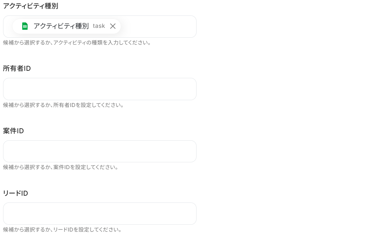 アクティビティ種別には取得した値が設定されているので、所有者IDや案件IDなどを任意で入力してください。