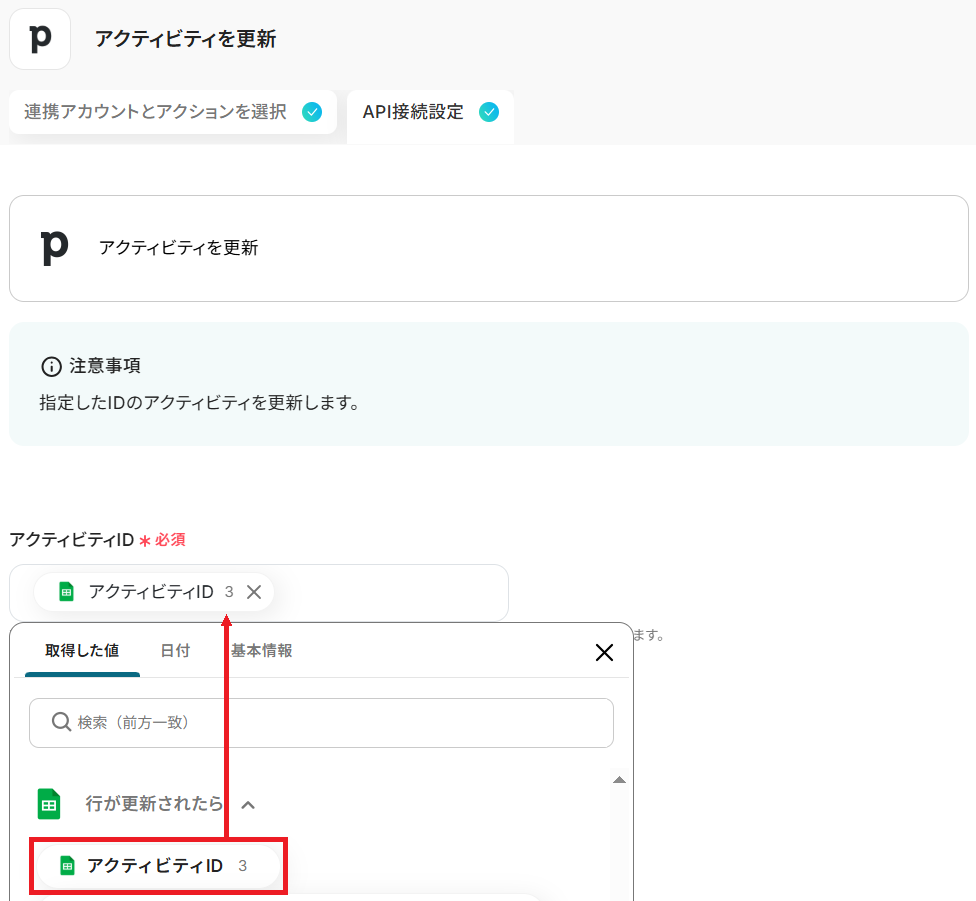 - Pipedriveでアクティビティを更新するアクションでは、更新対象のアクティビティIDやその他更新内容を、固定値またはGoogle スプレッドシートから取得した情報を用いて任意に設定が可能です。