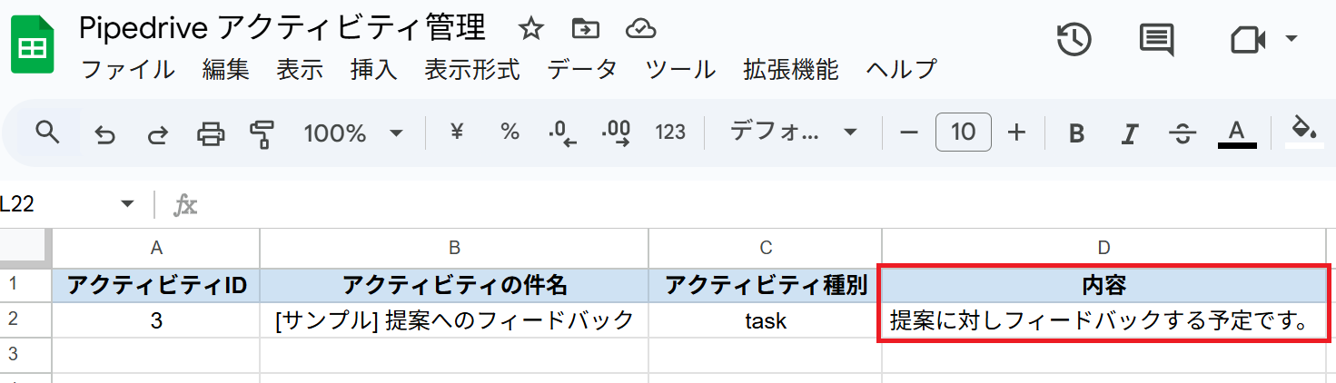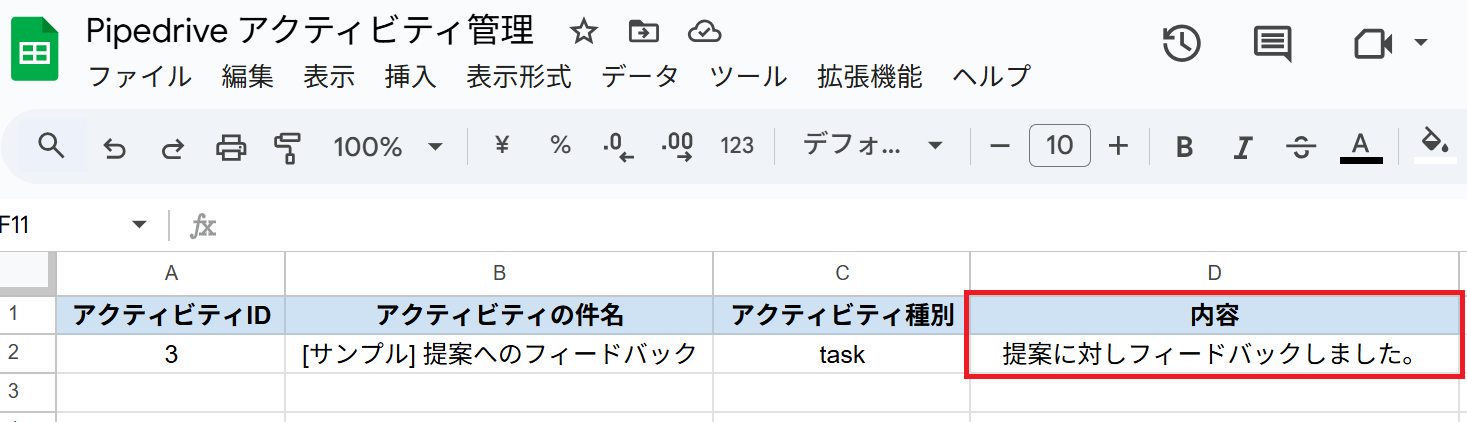 今回はD列の「内容」を更新し、Pipedriveに反映する想定で進めていきます。