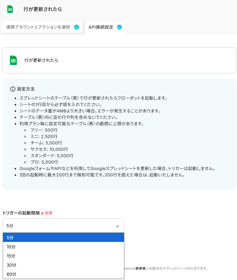 - トリガーは5分、10分、15分、30分、60分の間隔で起動間隔を選択できます。