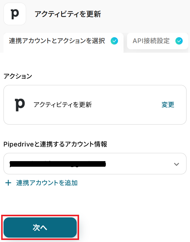 連携アカウントとアクションを選択する画面でPipedriveのアクションを「アクティビティを作成」に変更しましょう。