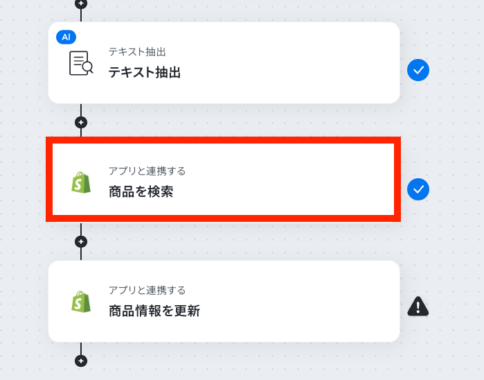 - 続いて、オペレーションでShopifyの「商品を検索」アクションを設定し、AIが抽出した情報を元に更新対象の商品を特定します。