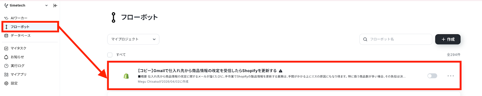 左側にあるメニューの「フローボット」から、コピーしたテンプレートを開きます。