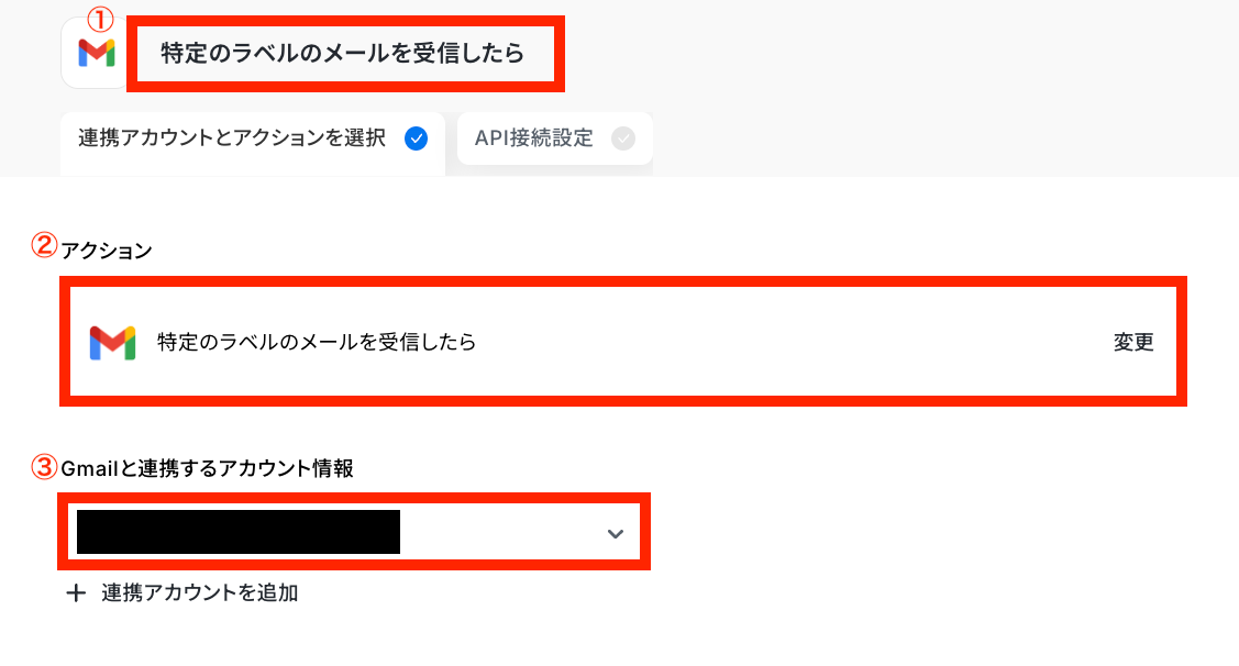③Gmailと連携するアカウント情報:ステップ1で連携したアカウントが表示されていることを確認しましょう。
