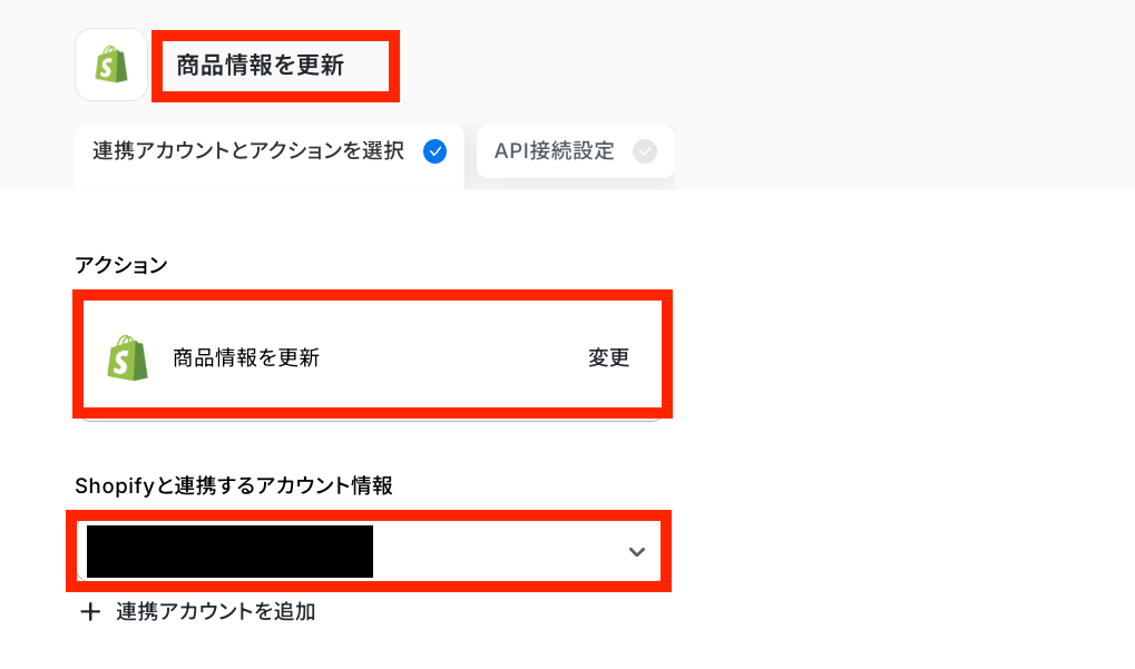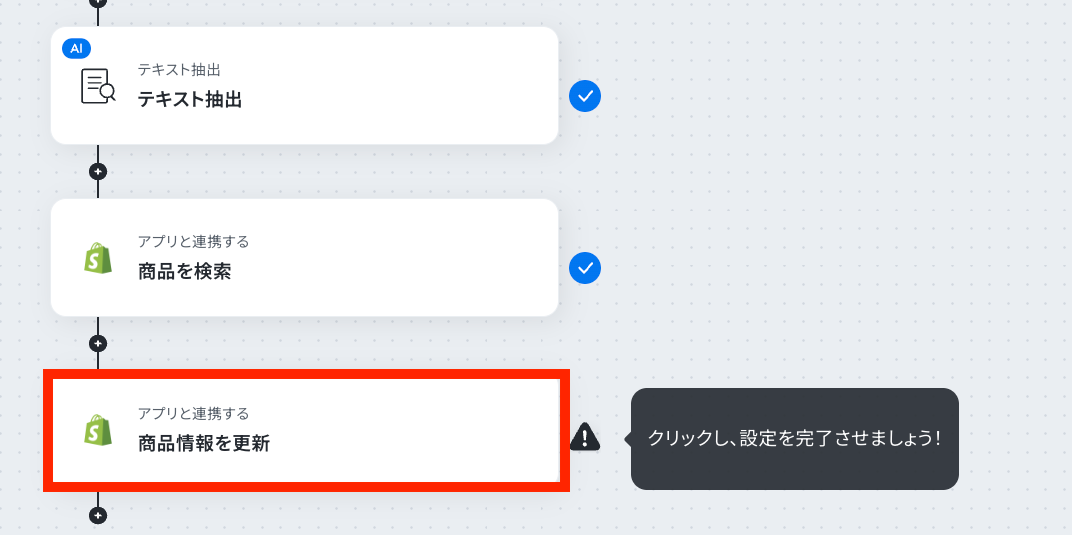 - 最後に、オペレーションでShopifyの「商品情報を更新」アクションを設定し、対象商品の情報を自動で更新します。