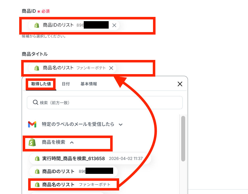 ①入力欄をクリックして「取得した値」を表示