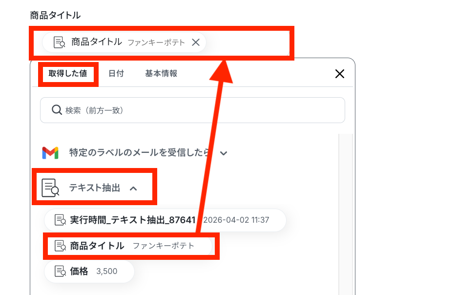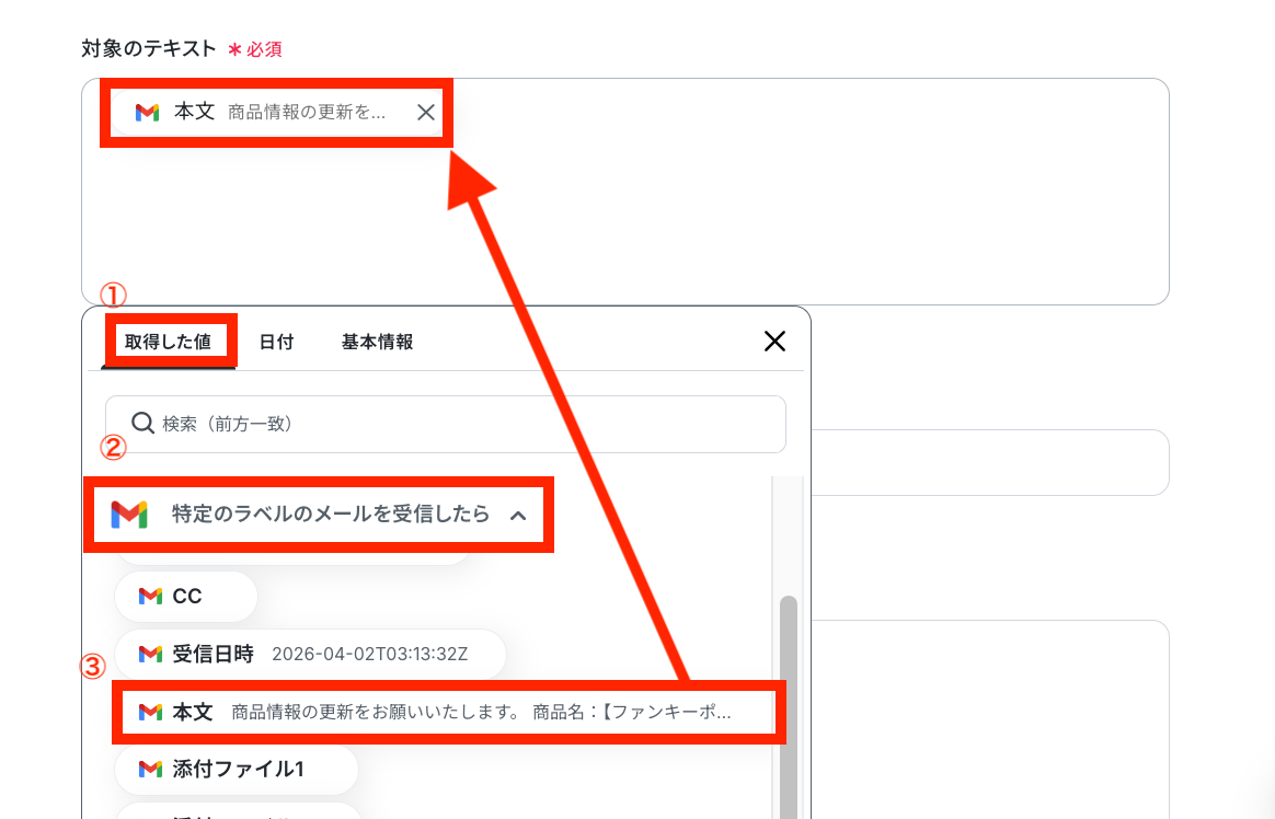次に「対象のテキスト」を設定しますが、手入力ではなくステップ3で取得した値を埋め込むのがポイントです!