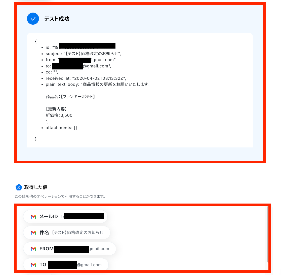テストに成功すると、Gmailのデータが「取得した値(※)」の欄に反映されるので、確認できたら「完了」をクリックしてください。
