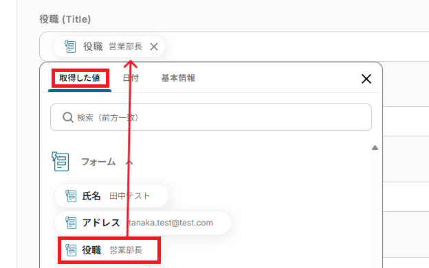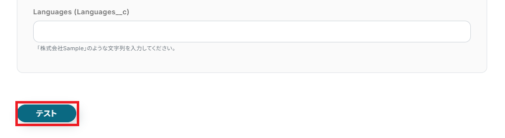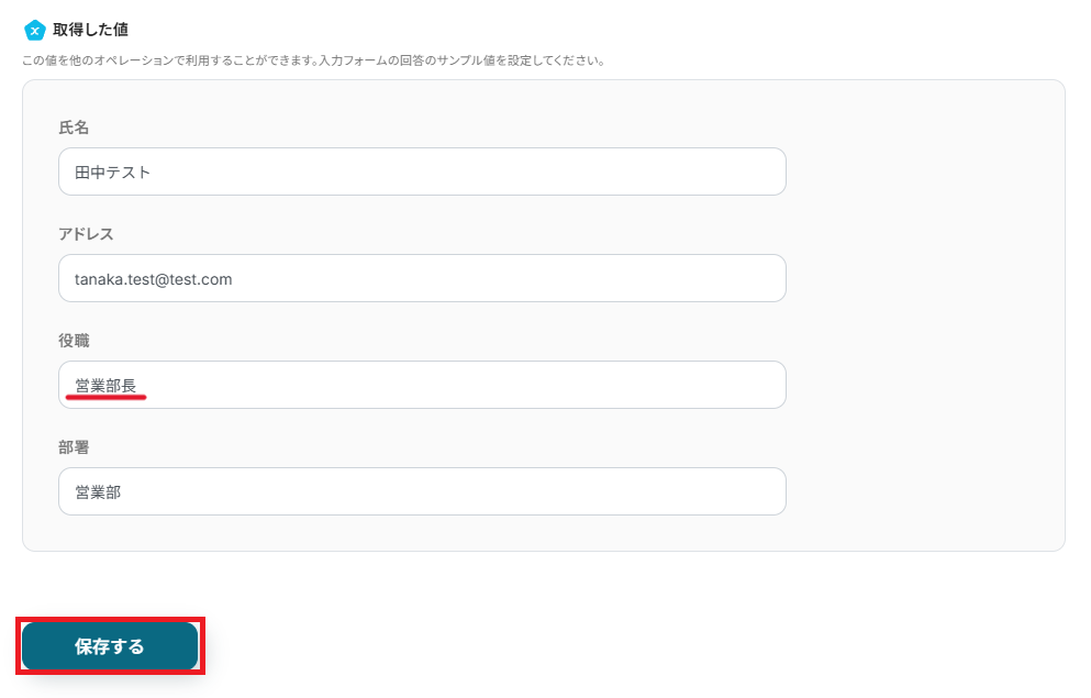 「取得した値」にはそれぞれ、Salesforceの更新テストで使用するサンプル値を設定しましょう。