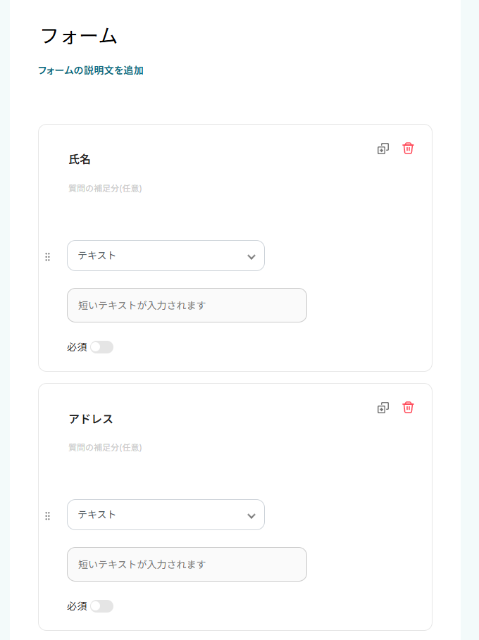 フォームは元から設定されており、「氏名」や「アドレス」が送信できるようになっています。