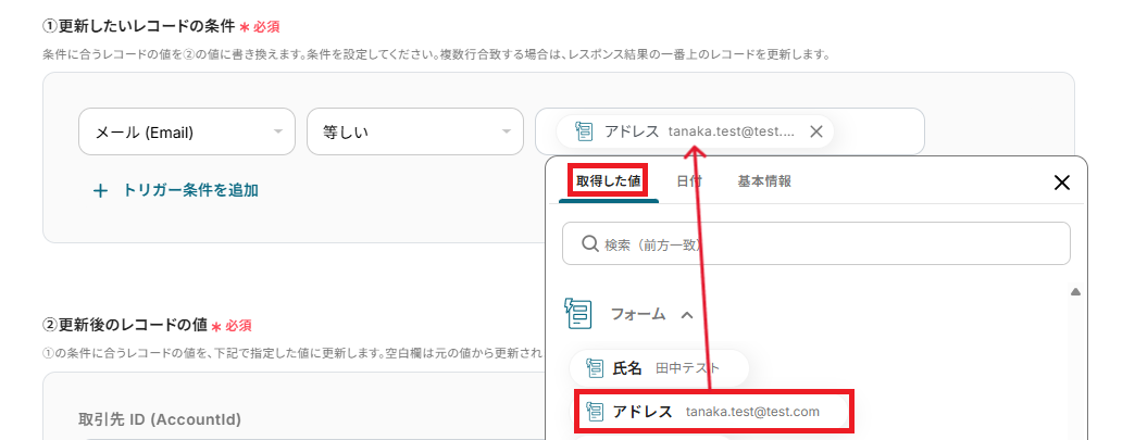 「更新したいレコードの条件」は、複数存在するレコードの中から更新対象となるレコードを指定します。