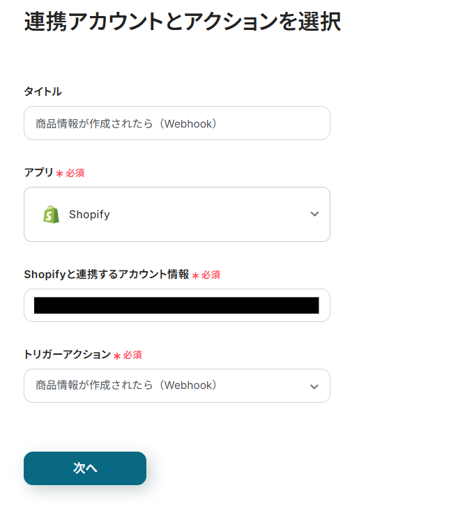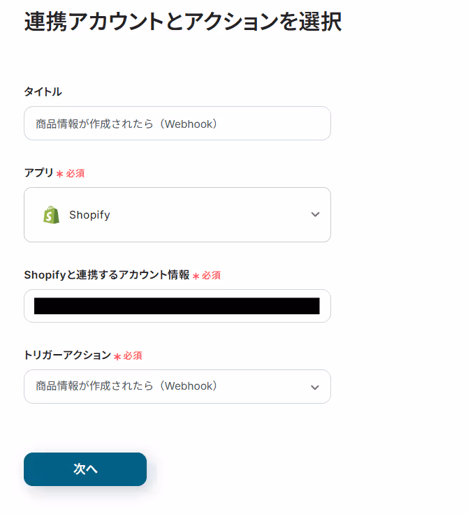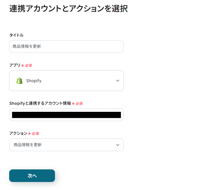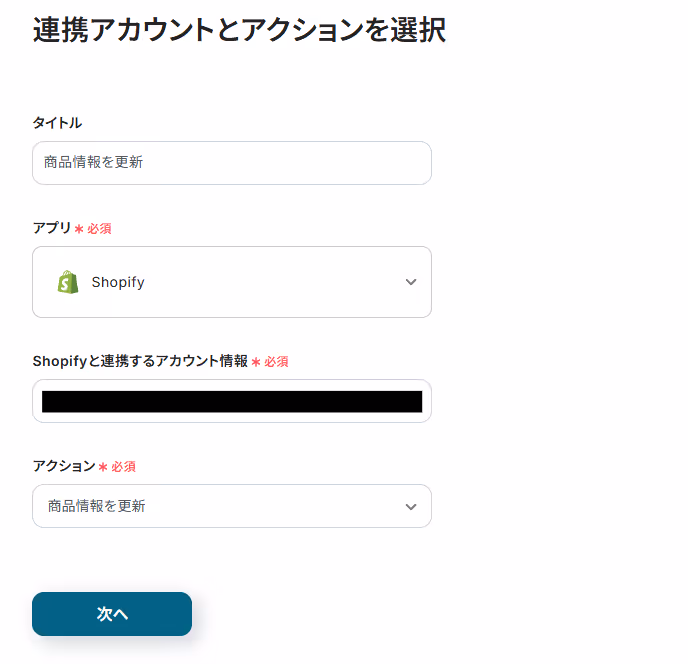 連携アカウントとアクションを選択する画面が表示されるので、今回連携するShopifyのアカウントを確認し「次へ」をクリックします。
