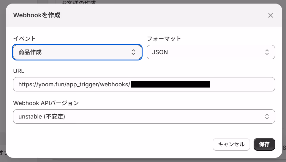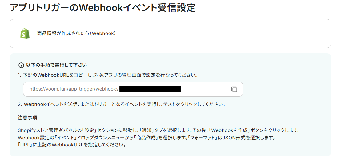 以下の画面が表示されるので、ShopifyでWebhookの設定を行いましょう。