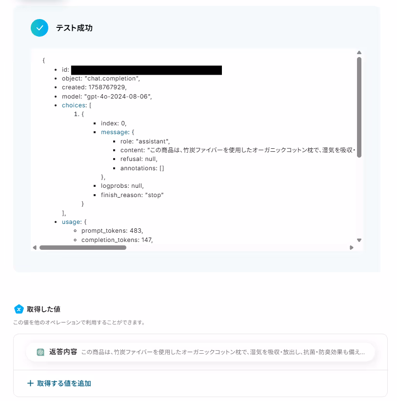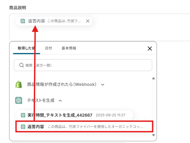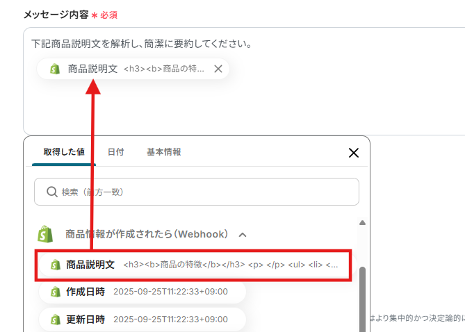 メッセージ内容にはChatGPTへの指示と、Shopifyから取得した値から「商品説明文」を選択し、入力しましょう。