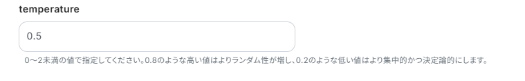 temperatureは値が高いとランダムで予測しにくい出力になり、面白く、斬新な提案がされることが多く、値が低いとより一貫した、明確で安定した出力が得られます。