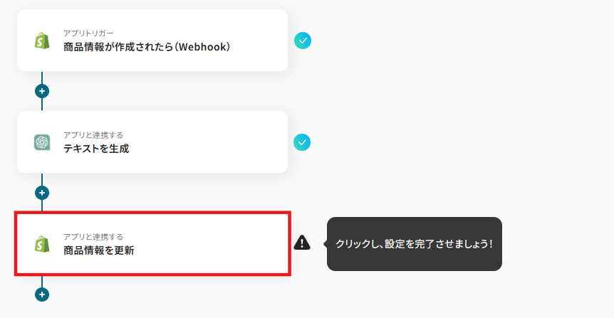 このワークフローを活用すれば、Shopifyに商品が登録されると、その情報を基にChatGPTが商品説明文を自動で生成し、該当の商品情報を更新します。