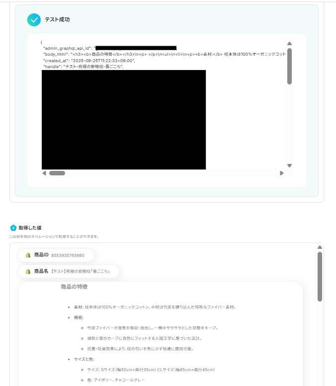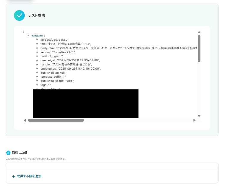 設定ができたら実際に商品情報を作成し、Yoomに戻り「テスト」をクリックします。以下の画面のように取得した値にメッセージの内容が表示されます。