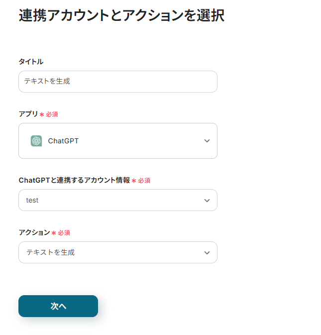 連携アカウントとアクションを選択する画面が表示されるので、今回連携するChatGPTのアカウントを確認し「次へ」をクリックします。