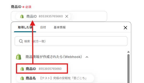 商品IDはShopifyから取得した値から選択し入力しましょう。