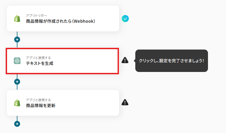 この連携フローには、特定の条件に合致した場合のみアクションを実行する「分岐」の処理が含まれているため、例えば「セール対象商品」や「新商品カテゴリ」だけに特化した説明文を自動生成するなど、より戦略的で柔軟な運用が可能になります。
